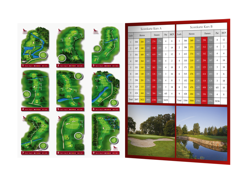Eine praktische Einstiegslösung, insbesondere für junge oder kleinere Anlagen, sind die BIRDIECARDS. Auf eine mehrfach gefalzten Klappkarte werden hier die Bahnlayouts und die Platzübersicht zusammen mit der Scorekarte und relevante Anlageninformationen kombiniert. Die Aufnahme von Sponsorenwerbung senkt Ihre Kosten.