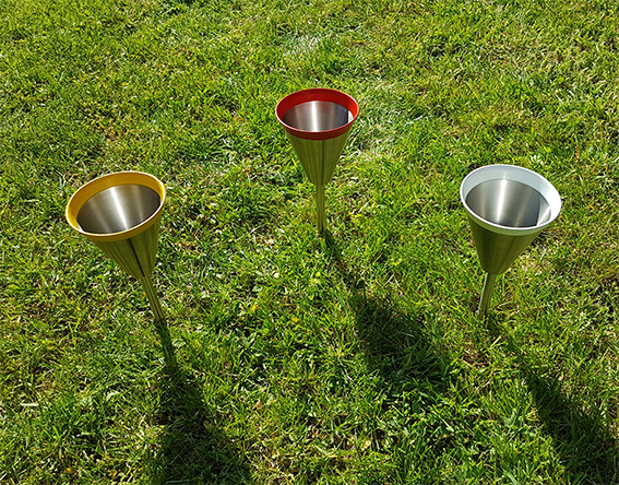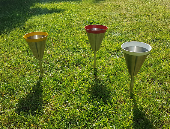 Die Fertigung nahtlos aus einem Stück geformter Hohlkörper aus geschliffenem Edelstahl ist eine tatsächlich sehr ambitionierte Herausforderung. Neben viel handwerklicher Erfahrung und Know How, benötigt man hierzu vor allem auch die entsprechenden Fertigungsmaschinen. Umso mehr freuen wir uns, Ihnen ab sofort unsere völlig neu entwickelten Broken Tee Caddy's anzubieten, die wir komplett im eigenen Hause für Sie fertigen. Der extrem robuste und selbstverständlich absolut rostfreie, kegelförmige Trichter hat ein Format von 100 x 100 x 2 mm. Das Qualitätsprodukt verfügt über einen integrierten, massiven Erdspike aus Edelstahlvollmaterial in der Länge 130 mm.