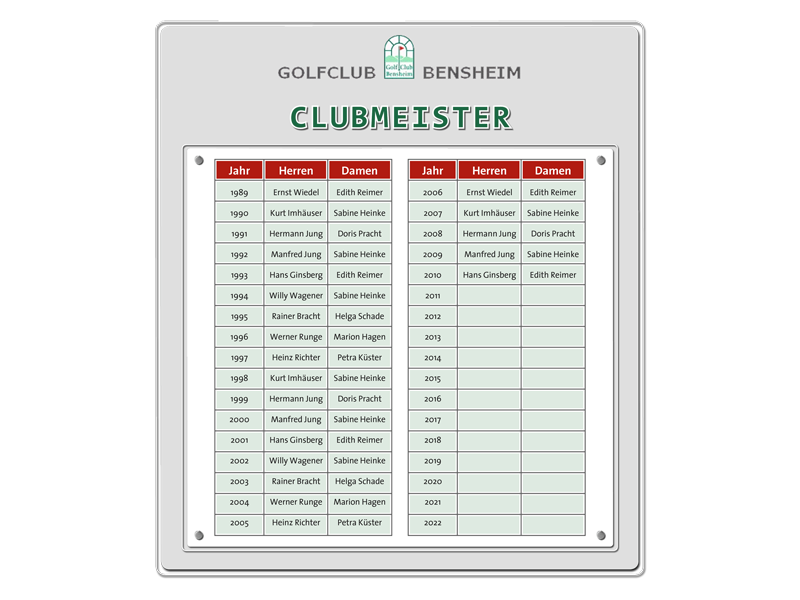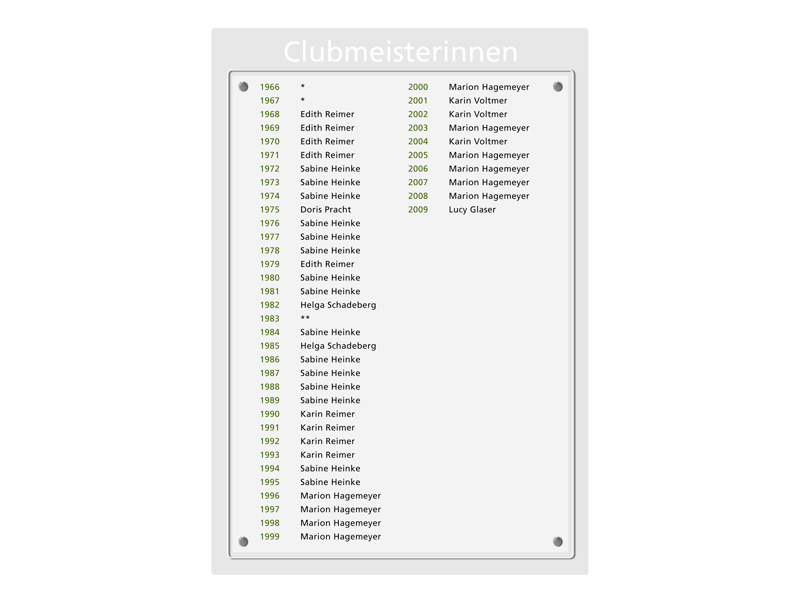 Bei der Gestaltung Ihrer EHRENTAFELN (CLUBMEISTERTAFELN, PRÄSIDENTENTAFELN, HOLE IN ONE TAFELN) setzen wir auf eine konsequente Weiterführung des Corporate Designs Ihres Clubs. Deshalb bieten wir Ihnen jeweils auch verschiedene Ausführungen. Ob Acrylglas, geschliffener Edelstahl oder Holz - entscheiden Sie selbst.