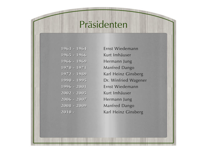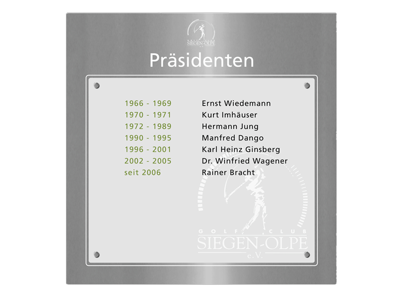 Bei der Gestaltung Ihrer EHRENTAFELN (CLUBMEISTERTAFELN, PRÄSIDENTENTAFELN, HOLE IN ONE TAFELN) setzen wir auf eine konsequente Weiterführung des Corporate Designs Ihres Clubs. Deshalb bieten wir Ihnen jeweils auch verschiedene Ausführungen. Ob Acrylglas, geschliffener Edelstahl oder Holz - entscheiden Sie selbst.