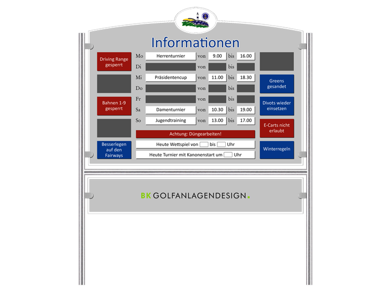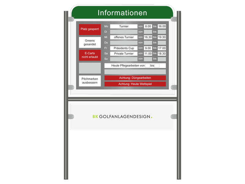 INFO LINE I - die klassische Informationstafel aus Acrylglas bietet viel Raum, um Ihre Golfer mit aktuellen Spiel- und Tagesinformationen zu versorgen. Die Tafelgestaltung sowie die Anordung der magnethaftenden Flächen für die Wechselschilder erfolgt detailliert nach Ihren Wünschen und Vorgaben.