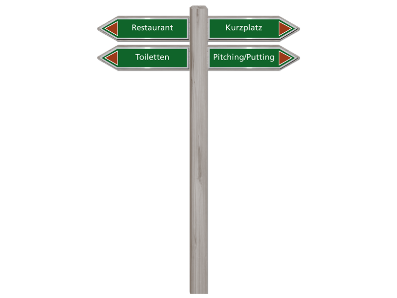Unsere WEGELEITSYSTEME führen den Golfer gezielt und zuverlässig zu den markanten Punkten auf der Golfanlage. Je nach Anforderung unterstützen wir die Orientierung der Besucher zusätzlich durch eine gezielte Zuordnung von Signalfarben und Piktogrammen zu den einzelnen Funktionsbereichen der Golfanlage. Ausführungsseitig setzen wir auf Vielfalt. Zur Auswahl stehen hier Varianten in Edelstahl, Aluminium, Acrylglas und in Hartholz, die sich auch im Materialmix untereinander kombinieren lassen.